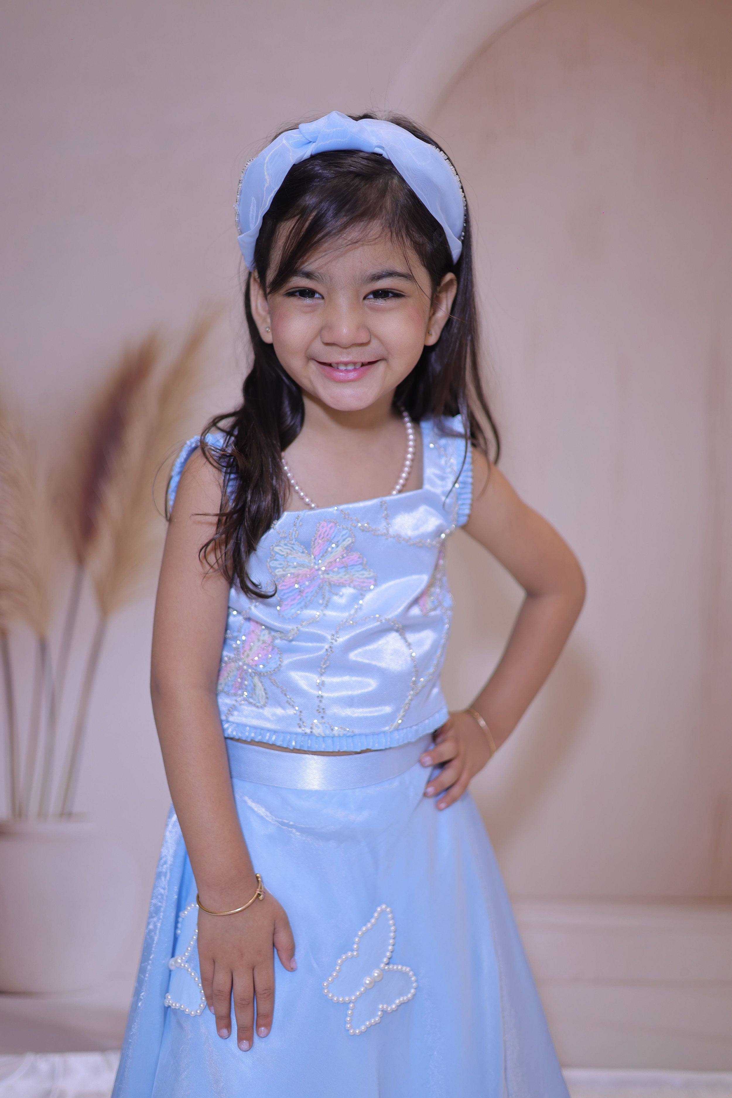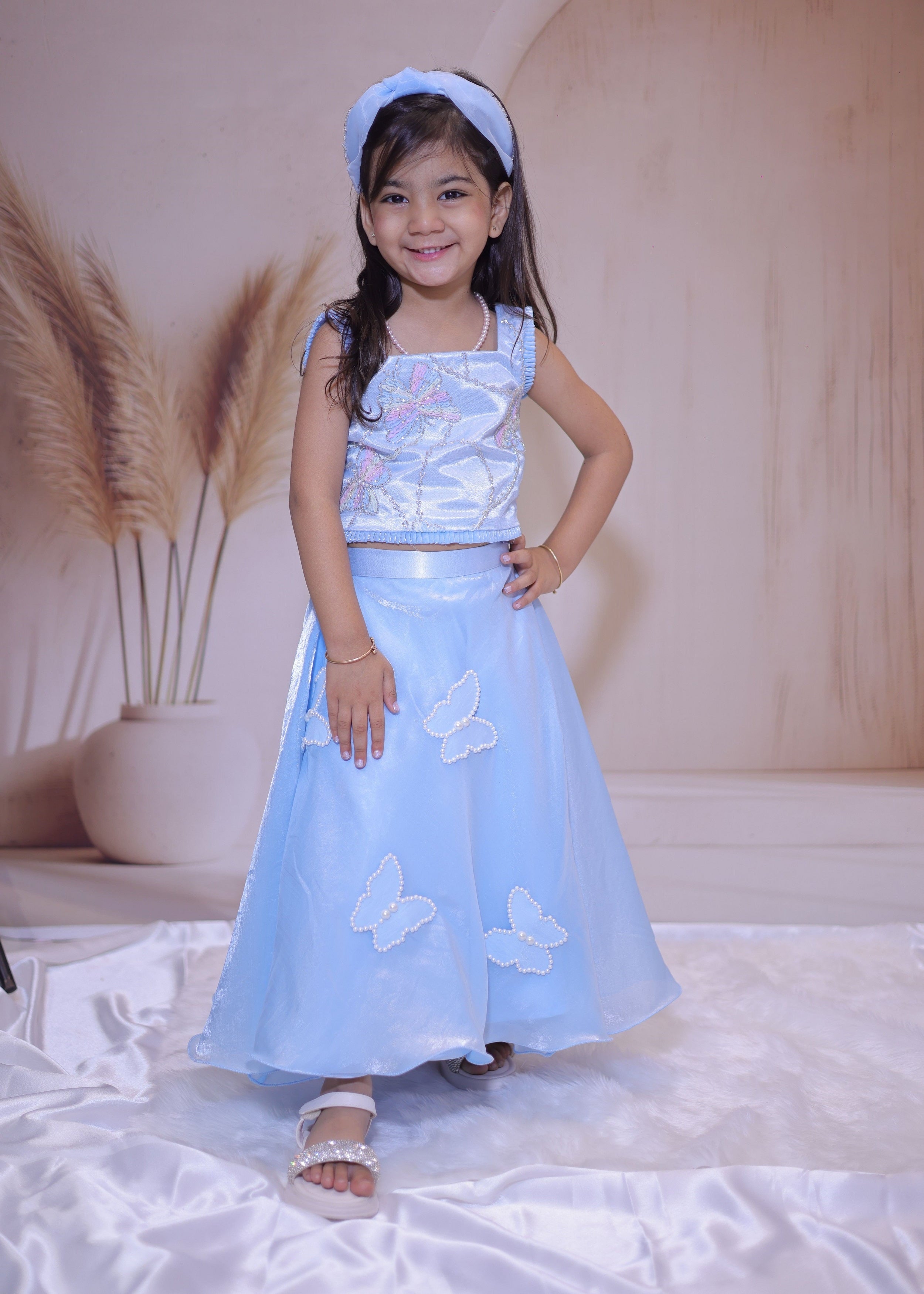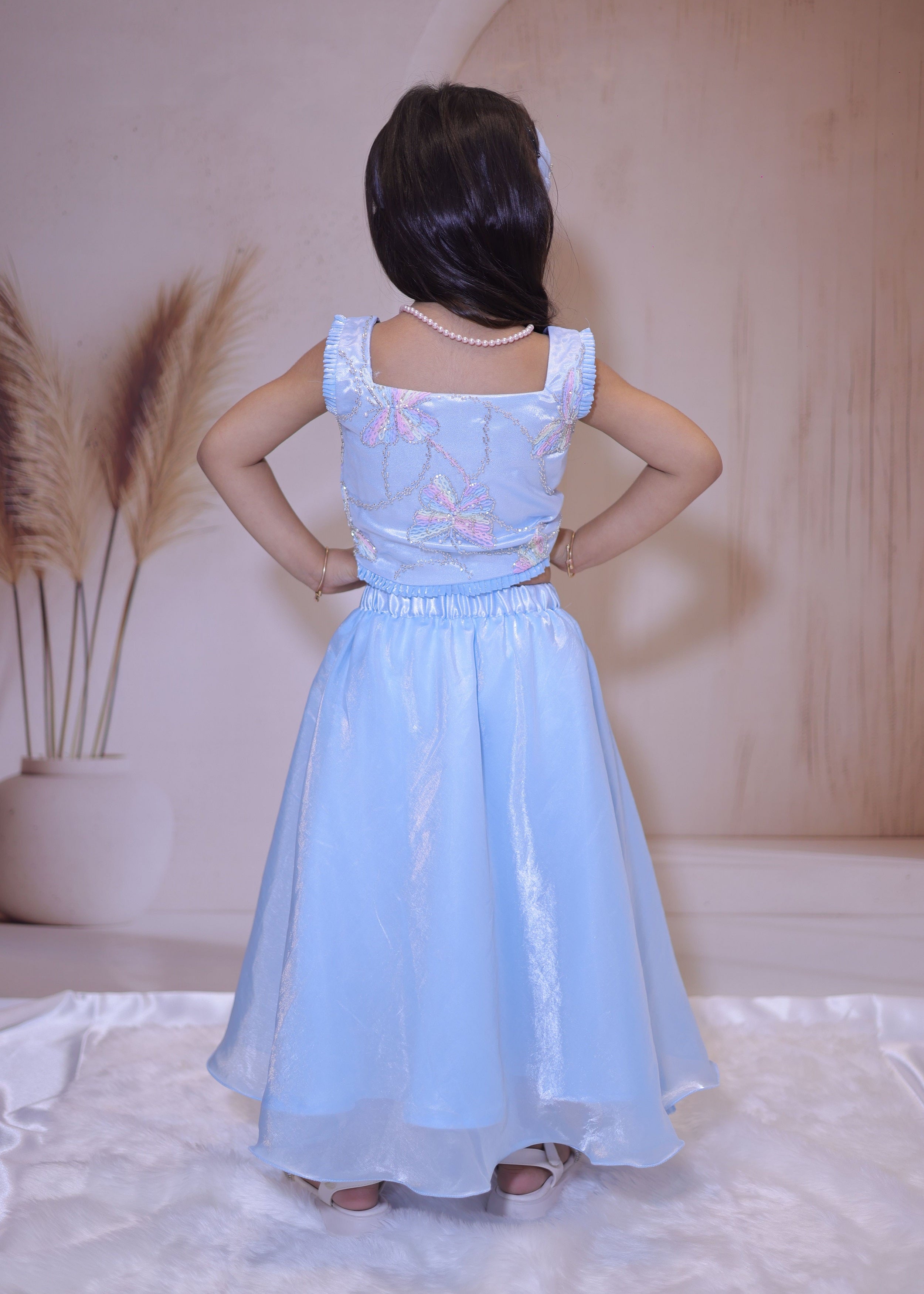 Let your little one dazzle in this enchanting two-piece set featuring a delicate pastel blue crop top adorned with embroidered butterfly motifs and sequin detailing. Paired with a flowy tissue skirt embellished with pearl-studded butterfly appliqués, this outfit is perfect for birthdays, family gatherings, and festive occasions. Crafted for comfort and style, it’s a dreamy addition to her wardrobe.