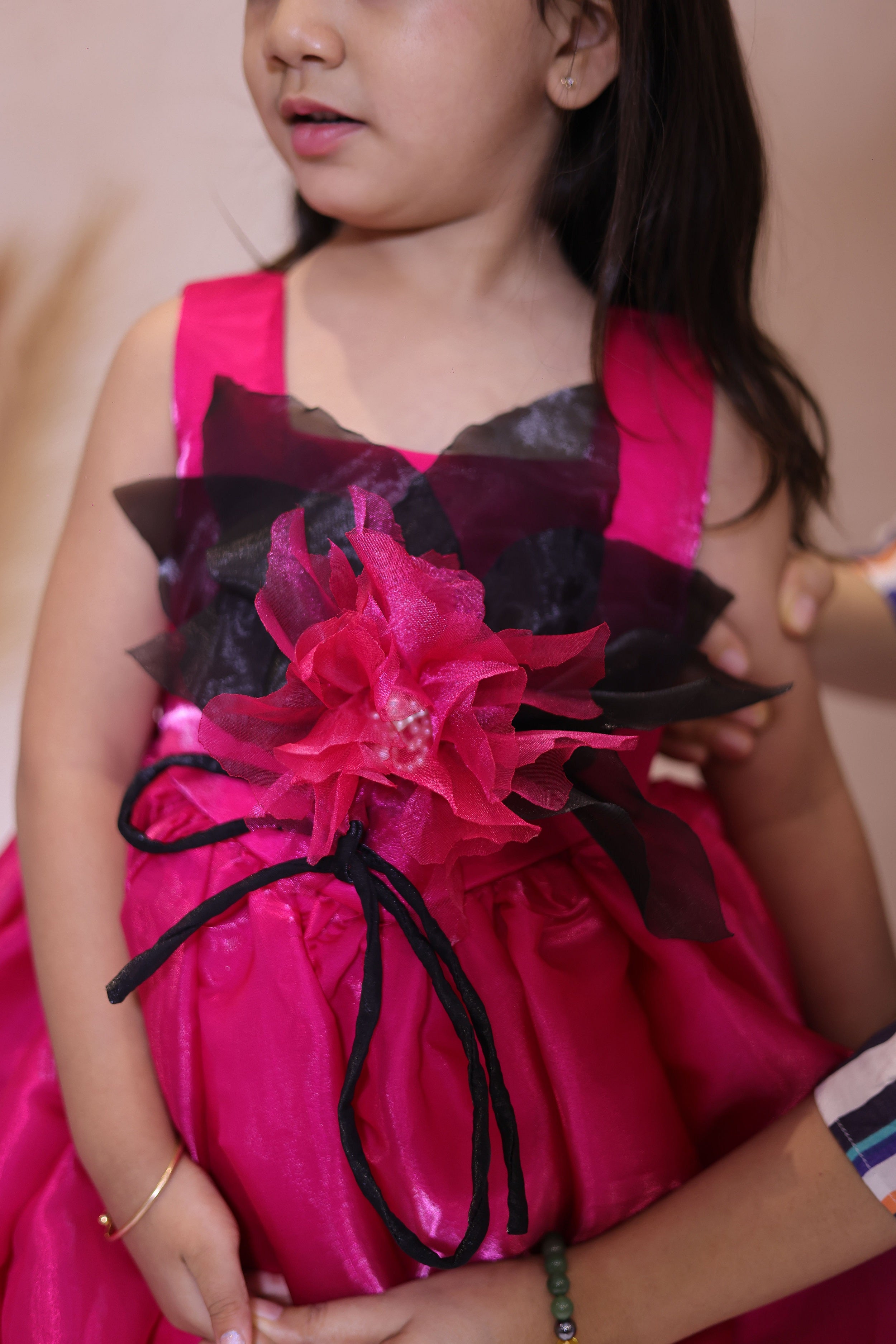 Floral Embellishments: A beautiful organza flower with pearl detailing adds a touch of elegance and charm to the waistline.